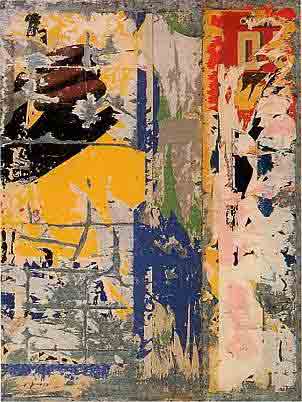 • 25 Raymond Hains Nouveau realisme, zeigt eine Decollage als gerahmter Teil einer abgerissenen Plakatwand. Hains präsentiert sie ohne sie weiter zu überarbeiten.