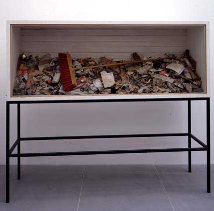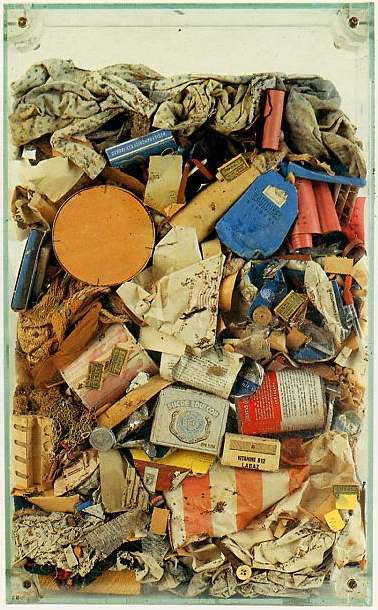 • 26 Arman, Poubelle ménagère, Spuren des Alltags im Ganzen. Chaotisch freie Anordnung von Alltagsgegenständen als Spuren zivilatorischen Lebens.