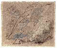 • 17 Henri Michaux, „Ohne Titel“, tachistische Fleckenmalerei. Tintenflecke oder Tuschflecke zeigen eine Suggestion vulkanischen Geschehens als Gesten seelischer Bewegung, die in den Flecken sichtbar werden. Ihr Wesen ist die Bewegung, ihre Erscheinung die Spur. Vorstellungen, bereits vorhandene Bilder, die durch mein Gedächtnis ziehen, werden dadadurch gezwungen unmittelbar zu erscheinen. Es muss etwas sein, das beim Betrachter sofort etwas erzeugt, das dessen innere Welten anspricht.